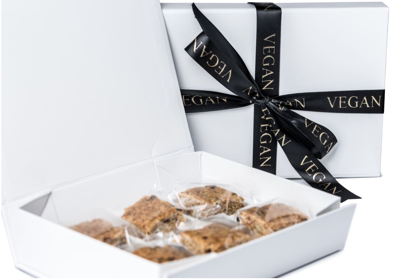 6 Vegan Flapjacks with branding or personalisation on the lid and each flapjack, a gift message inside the box and presented with hand tied ribbon.