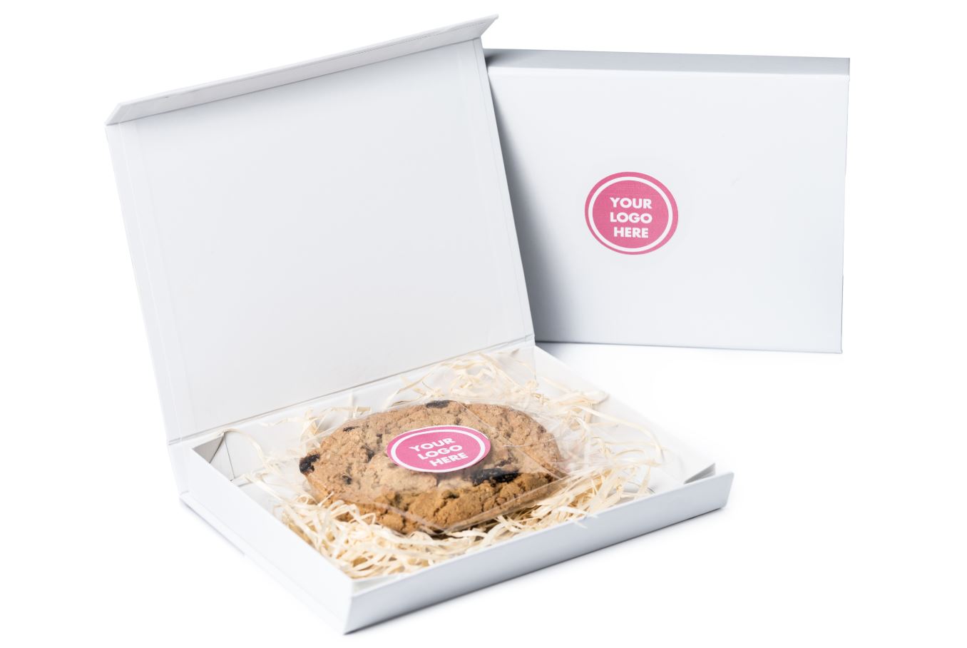 A giant chocolate chip cookie personalised with your message, argwork or logo. Branding or personalisation on the lid and gift message inside the box.