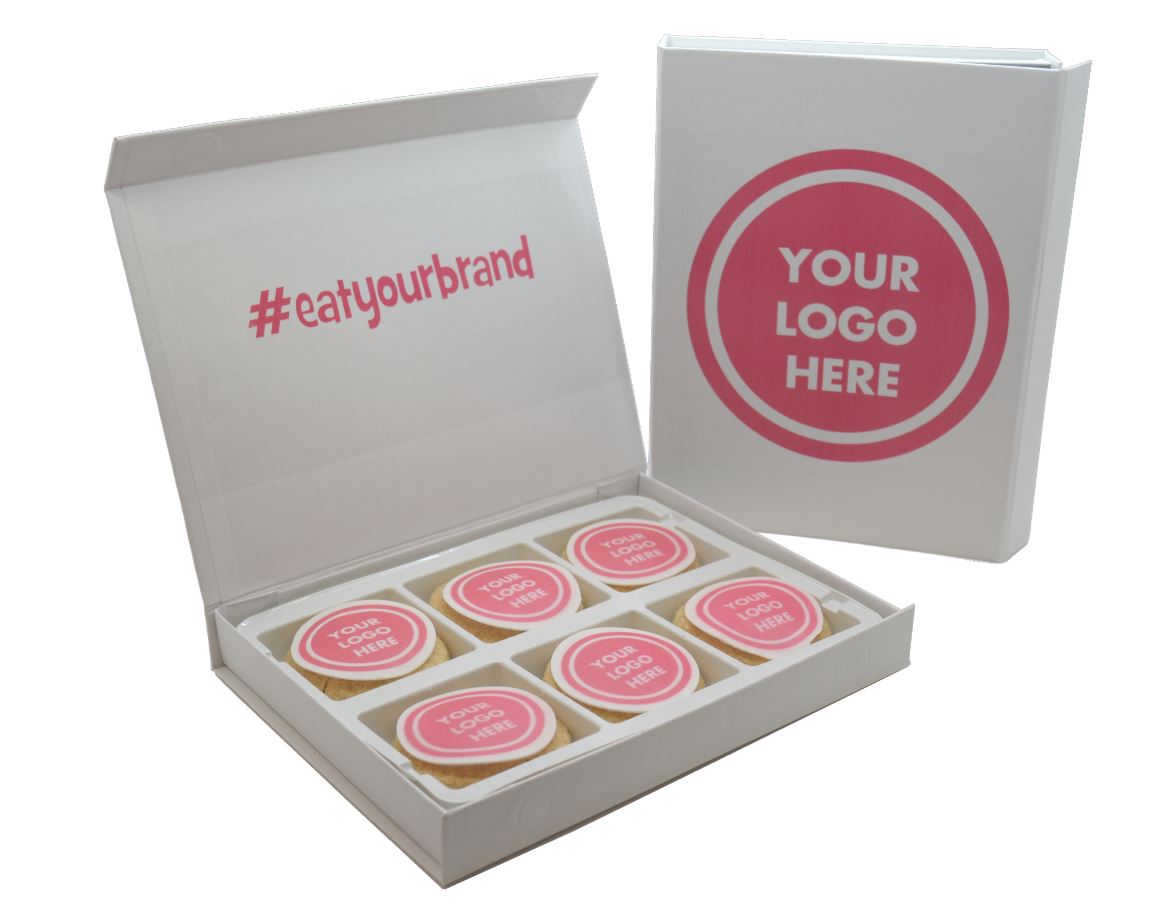 6 delicious melt in the mouth shortbread cookies with icing on the top. Put your logo or a message on each cooke as well as the lid of the box. Gift message inside the box.
