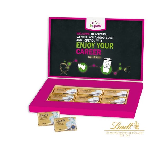 Branded with your logo and busness message this luxury Lindt Gift contains 6 foil wrapped chocolate bars wrapped in gold foil.