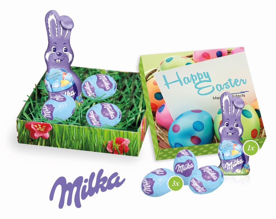 Printed Milka square Easter nest box - contains 3 x Milka eggs and 1x Lindt Milka Easter Bunny