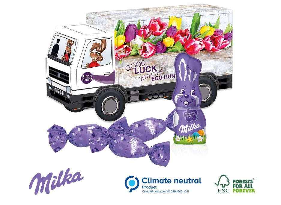 Milka Easter Truck contains 1 chocolate Easter Bunny and 3 Milka chocolate Easter Eggs.