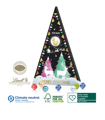 Personalised Lindt Advent Christmas tree. The calendar is fully printed all over with your own artwork, or choose from one of our standard designs 260x410x24mm. Contains 24 delicious Lindor mini balls in a variety of flavours 110g