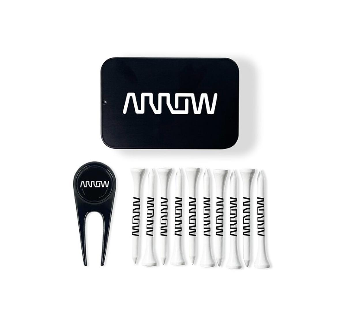 Includes packed loose 10 x 70mm or 54mm White bamboo tees printed up to 3 colours on the shank, 1 x Revo metal divot/repair tool with 25mm Black nickel full colour resin dome removable ball marker and print to the tin