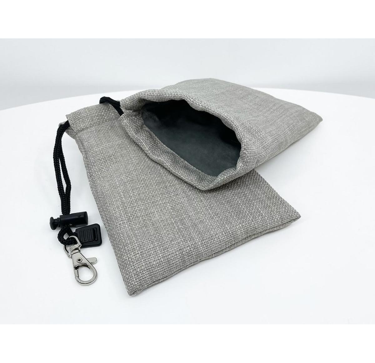 Valuables Drawstring Bag (empty) with Silver carabiner, printed to the front