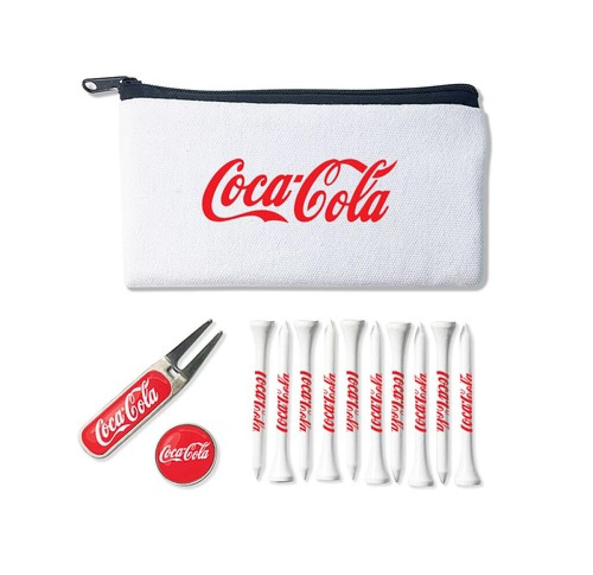 Includes packed loose 10 x 70mm or 54mm White bamboo tees printed up to 3 colours on the shank, 1 x Metal bent divot/repair tool with full colour resin dome to the handle, 1 x 25mm Black nickel full colour resin dome ball marker and print to the bag