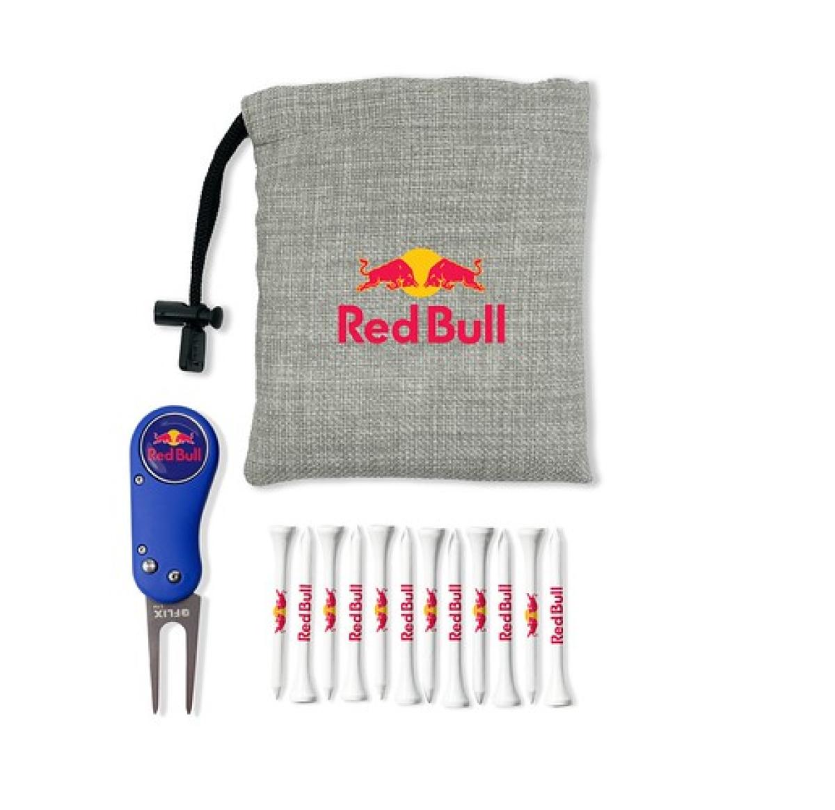 Includes packed loose 12 x 70mm or 54mm White bamboo tees printed up to 3 colours on the shank, 1 x Flix Lite automatic opening divot/repair tool with 25mm Black nickel full colour resin dome removable ball marker and print to the bag