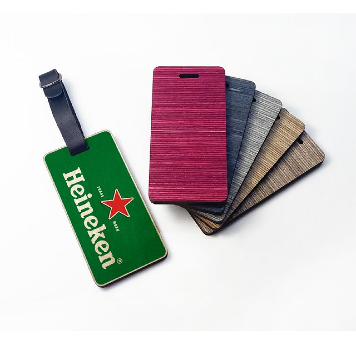 Wooden ply luggage tag digitally printed with Black leatherette buckle strap. 6 colour choices