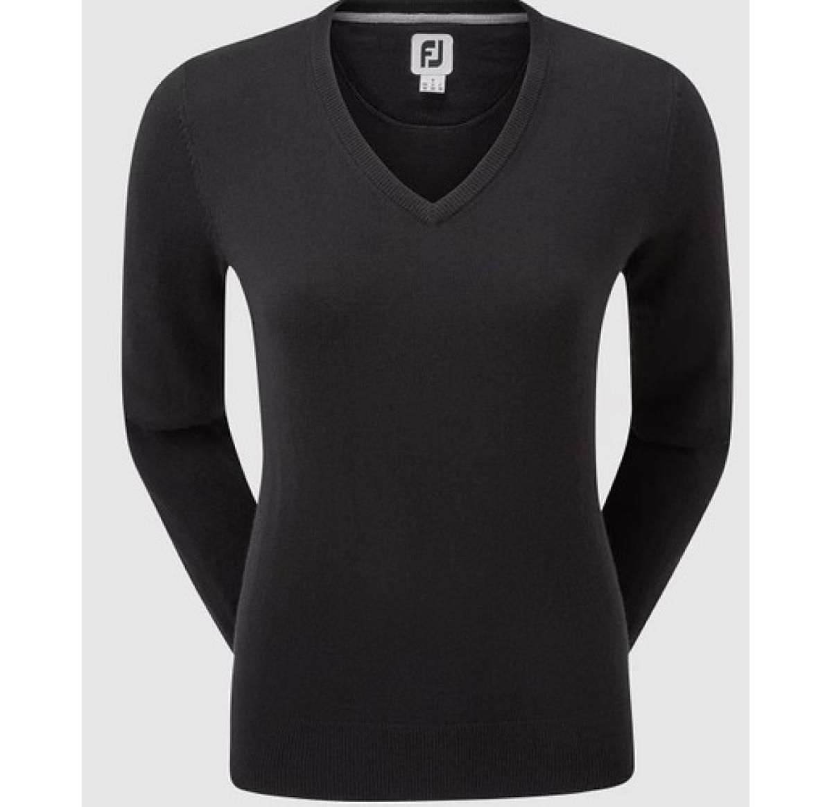 FJ (Footjoy) Women's Wool Blend V-Neck Golf Pullover with your logo embroidered to 1 position with default position being on the wearer's left chest. Premium wool blend fabric provides the warmth and comfort of a natural fibre. Elasticated knit cuffs and waistband. Fully fashioned construction
