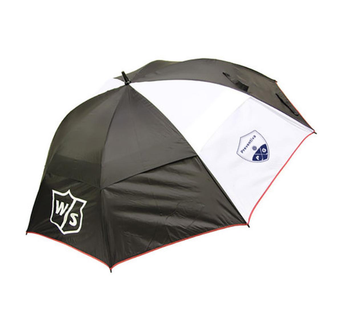 Wilson Golf Umbrella as used on the Tour. 68" (172.72cm), double rib heavy duty frame, double canopy, high wind resistance, non-slip rubber handle and matching sleeve. 2 x White panels printed with your logo at maximum print area of 200 mm x 120 mm