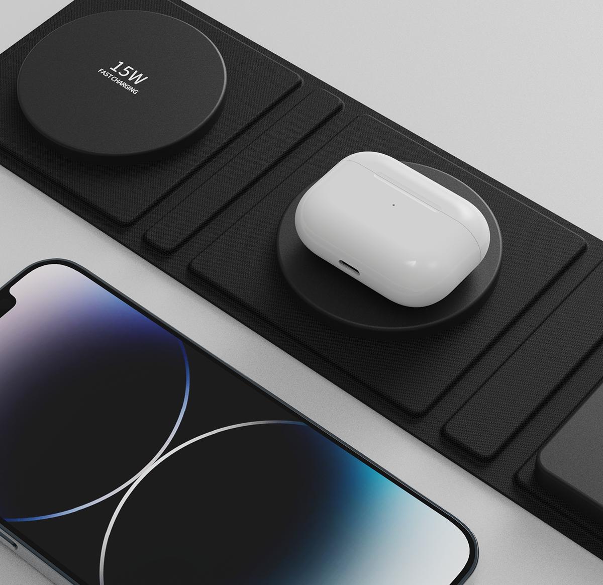 15W folding wireless charger for simultaneous charging. Features 3 magnetic charging pads suitable for phones, AirPods and smart watches. Folds up neatly with secure magnetic closing for travel and storage. Supplied with USB C charging cable. RoHS compliant