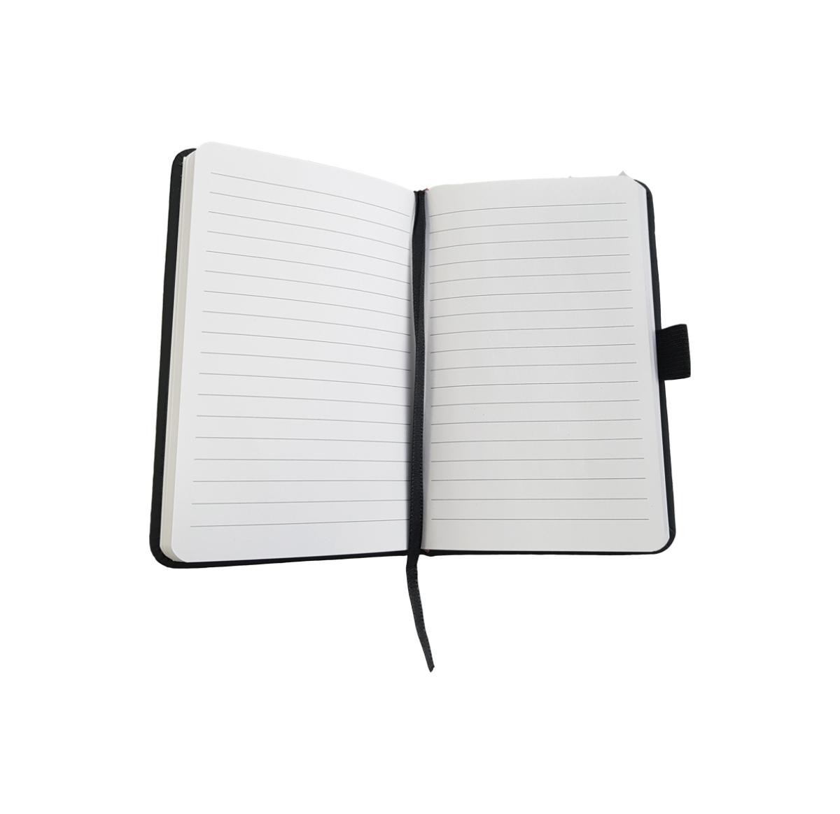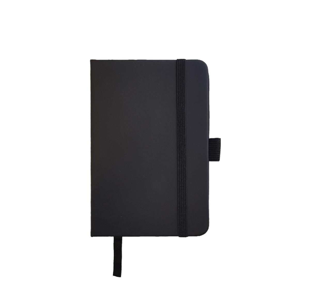 Ultimate A6 Notebook with a soft PU cover, 80 white lined pages (160 sides), ribbon marker, elastic strap closure and pen loop. A high quality budget notebook.