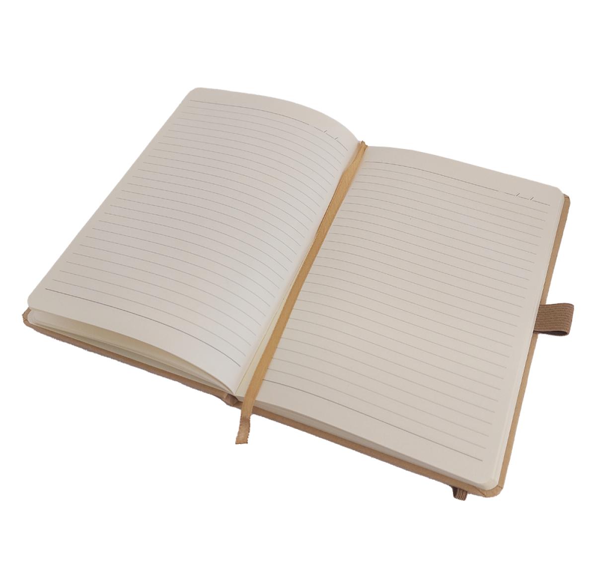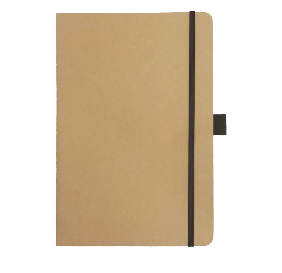 Eco notebook with Kraft paper cover with elastic closure, elastic pen loop and ribbon marker. Inside is 80 sheets of cream recycled 70gsm paper. Available in natural or black trim.