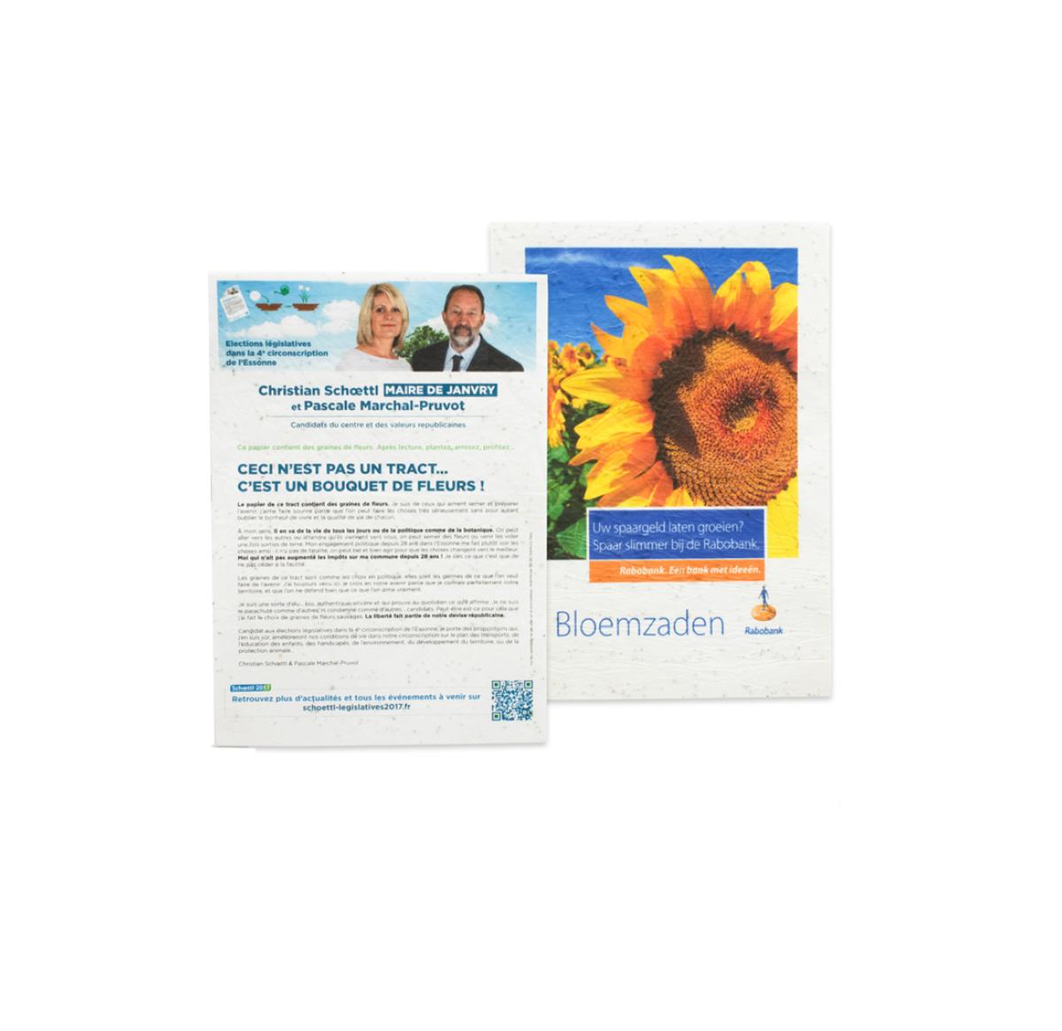 50g Seed paper in a shape of your choice within the maximum sizes of A4. Two layers of biodegradable paper with standard flower mix seeds in between. Printed full colour to one side.