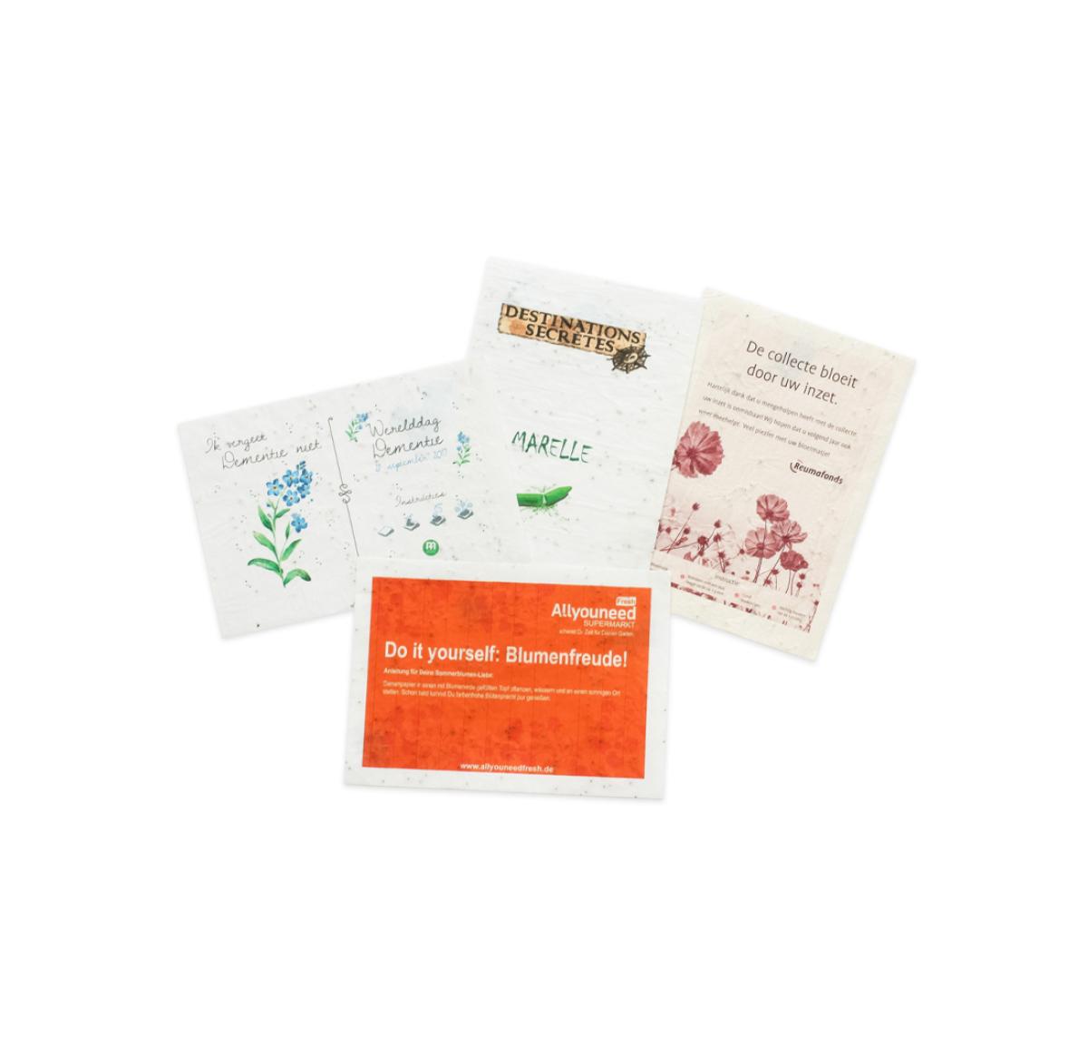 50g Seed paper in a shape of your choice within the maximum sizes of A6. Two layers of biodegradable paper with standard flower mix seeds in between. Printed full colour to one side.