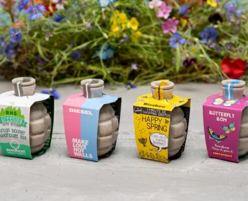 Agency clients & retail wholesalers will love these fun garden grenades! Seedboms are eco-friendly bombs that ‘explode’ with seeds. Great for guerrilla gardening – just drop in a patch of untended earth, and the packaging will degrade and flowers grow.