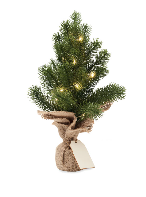 Mini artificial (PE) Christmas tree with 20 LED warm yellow string lights on ajute base. Comes with a wooden gift tag. 2 AA batteries excluded. Decorate yourhome or office space with this tiny festive tree. Thanks to the 20 LED lights,this decoration will create a nice atmosphere. Because it is artificial, you canreuse it next year.