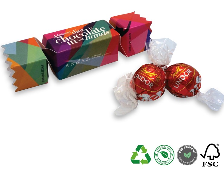 Digitally printed card Cracker with a unique twist opening, containing two Lindt chocolate truffles .