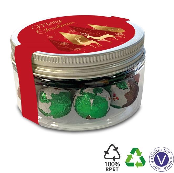 Clear 100ml tub containing chocolate balls, personalised with a digitally printed label.