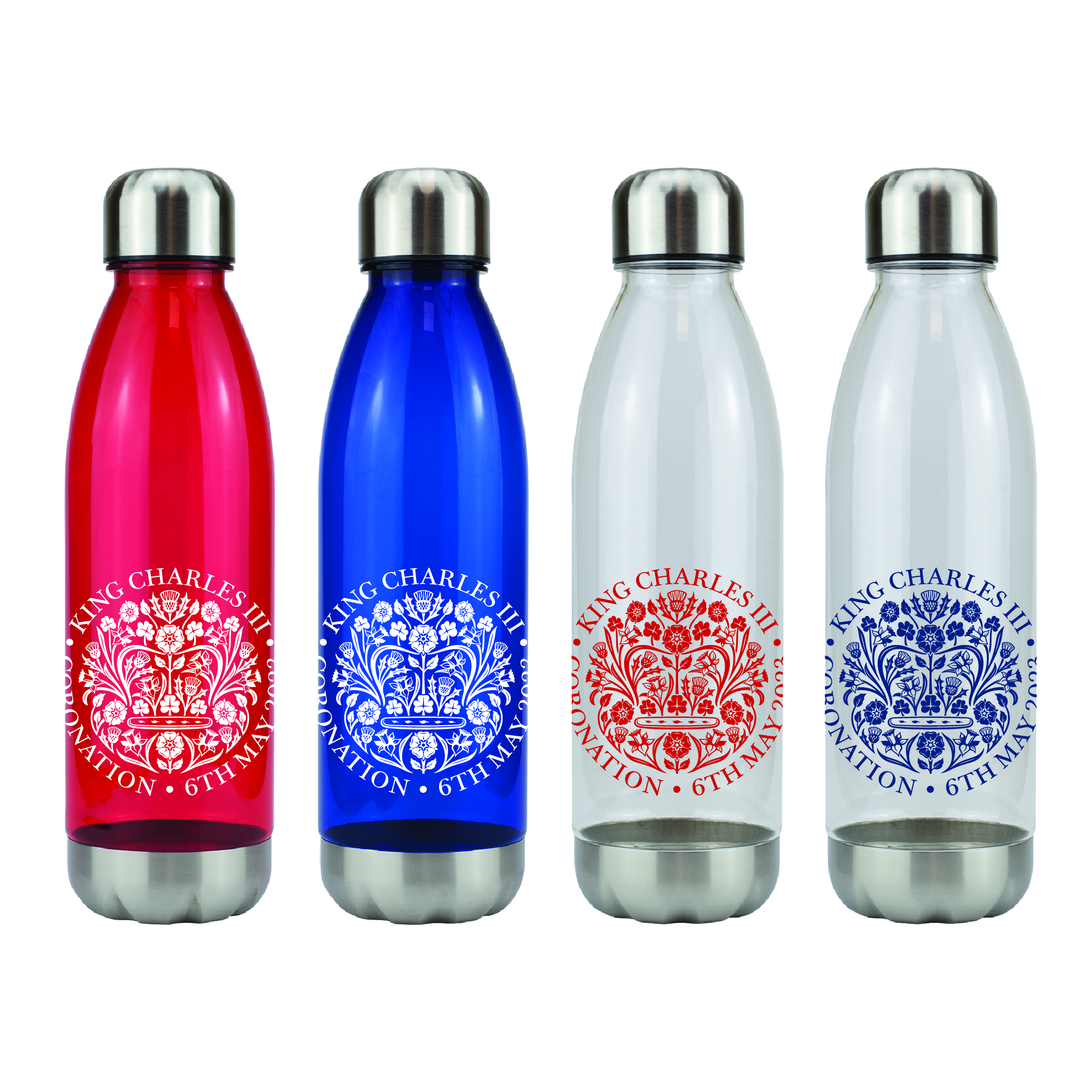 Celebrate the Kings Coronation with a water bottle, 500ml plastic with stainless steel screw top and bottom. Available in transparent red, blue or clear