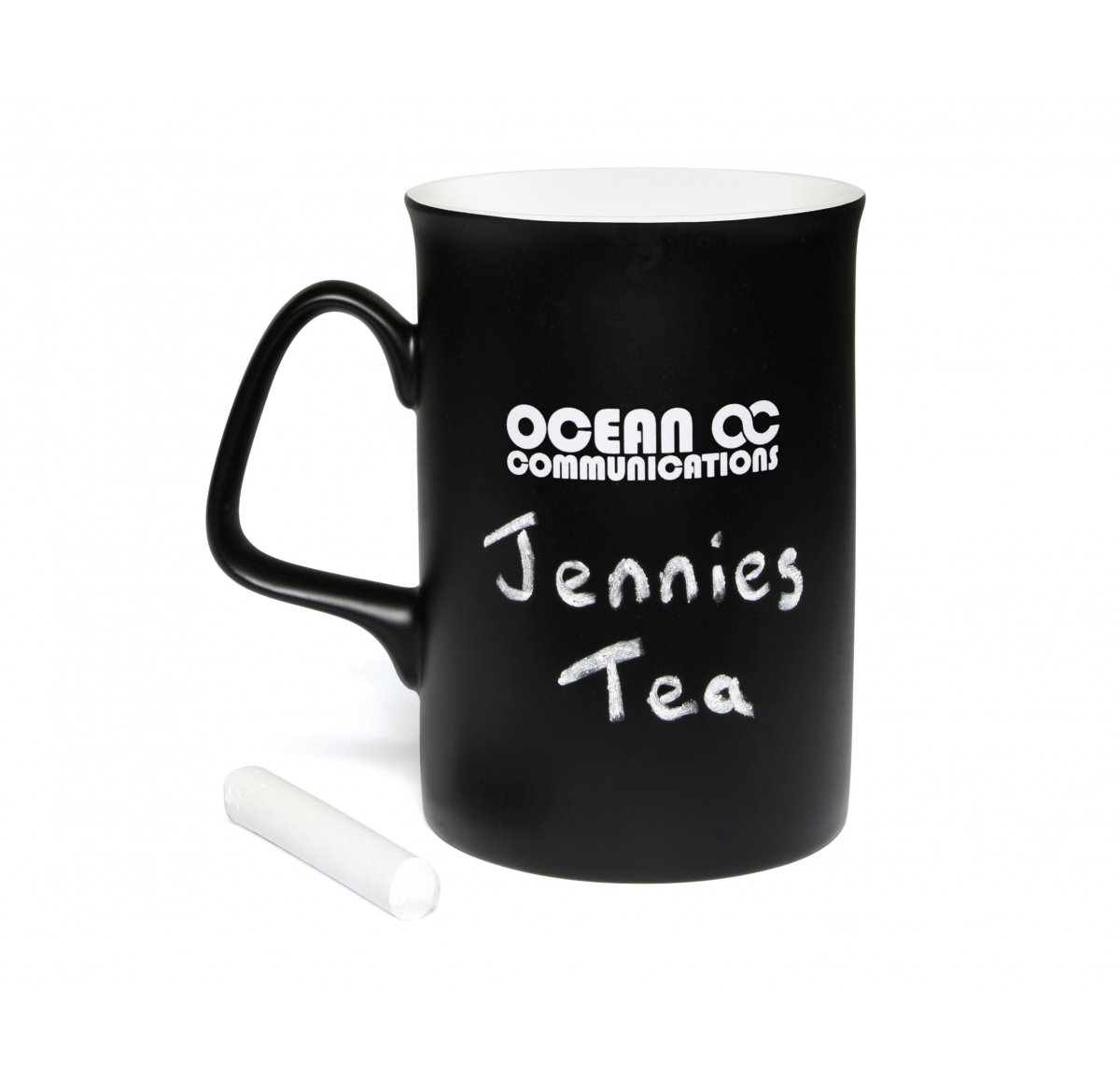 Fun and interactive chalk mugs supplied with a piece of chalk, enabling the user to write their own message on the mug.