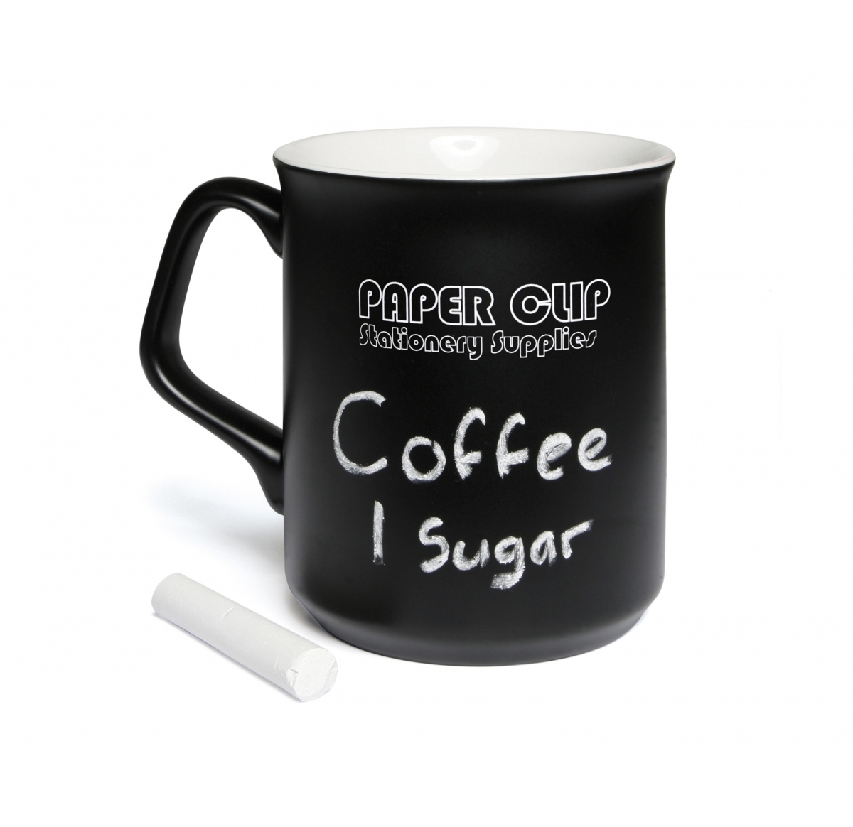 Fun and interactive chalk mugs supplied with a piece of chalk, enabling the user to write their own message on the mug.
