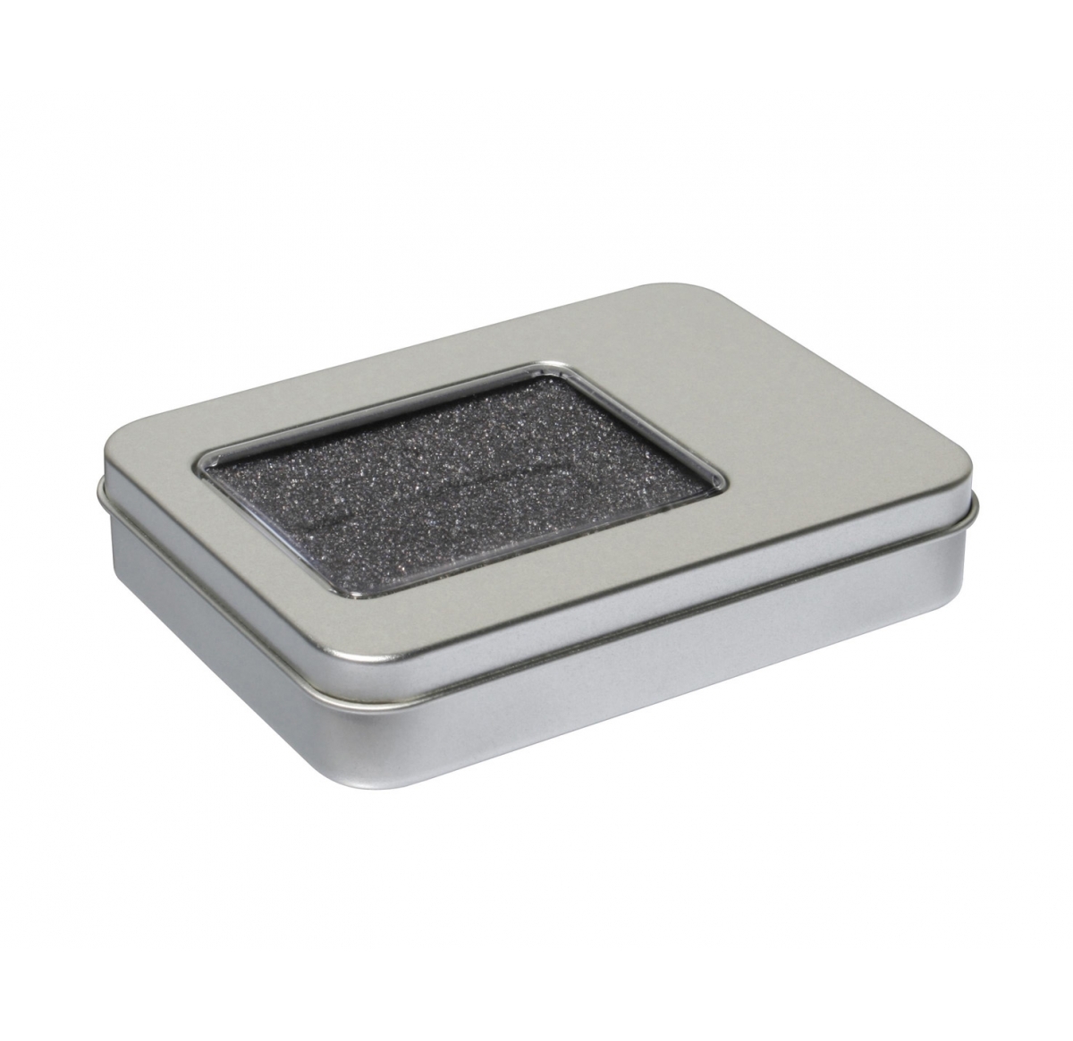 A flat rectangular tin with a window in for displaying the flashdrive. Can be printed to double the impact of your message. Please note that this item is only available when purchased with one of our USB drives.