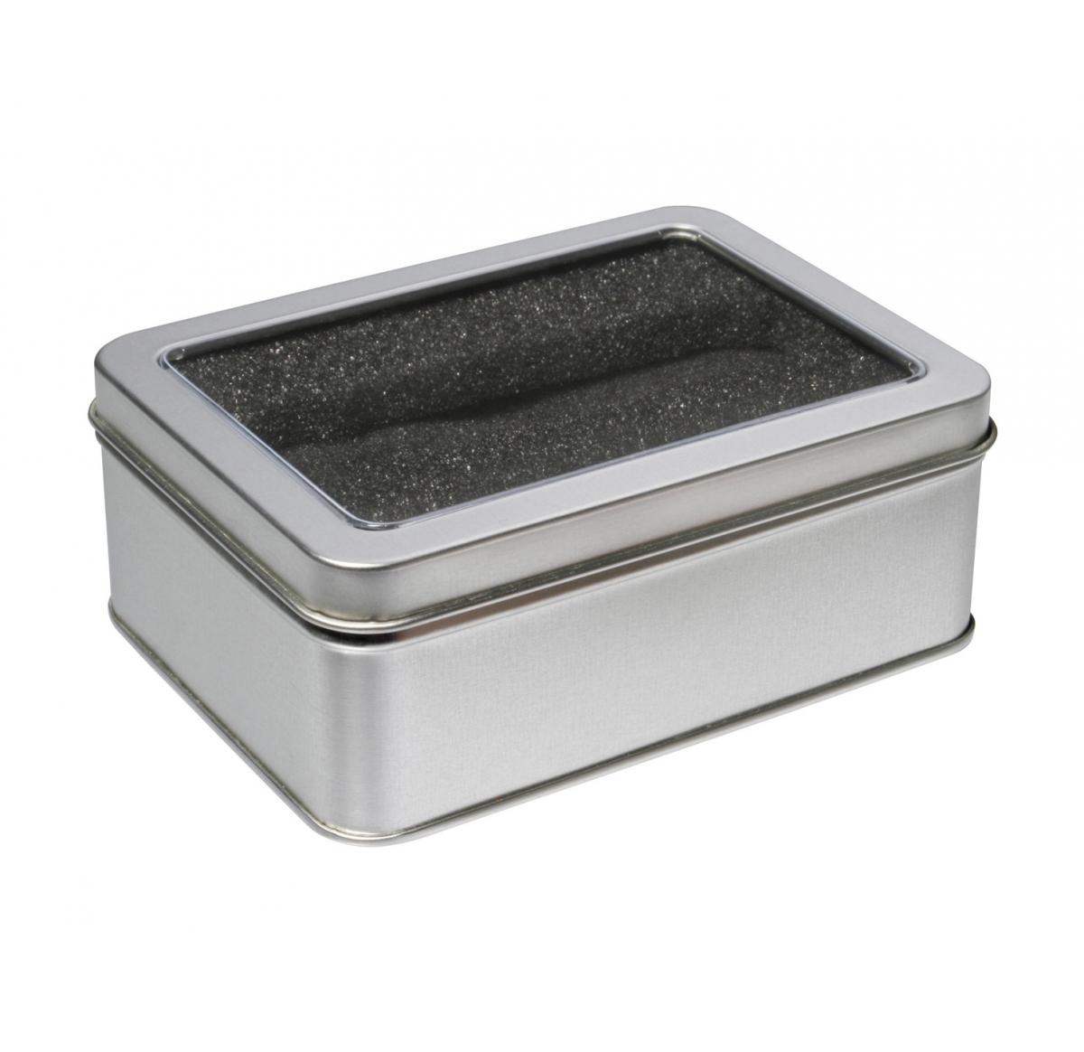 A rectangular tin with a window in for displaying the flashdrive. Please note that this item is only available when purchased with one of our USB drives.