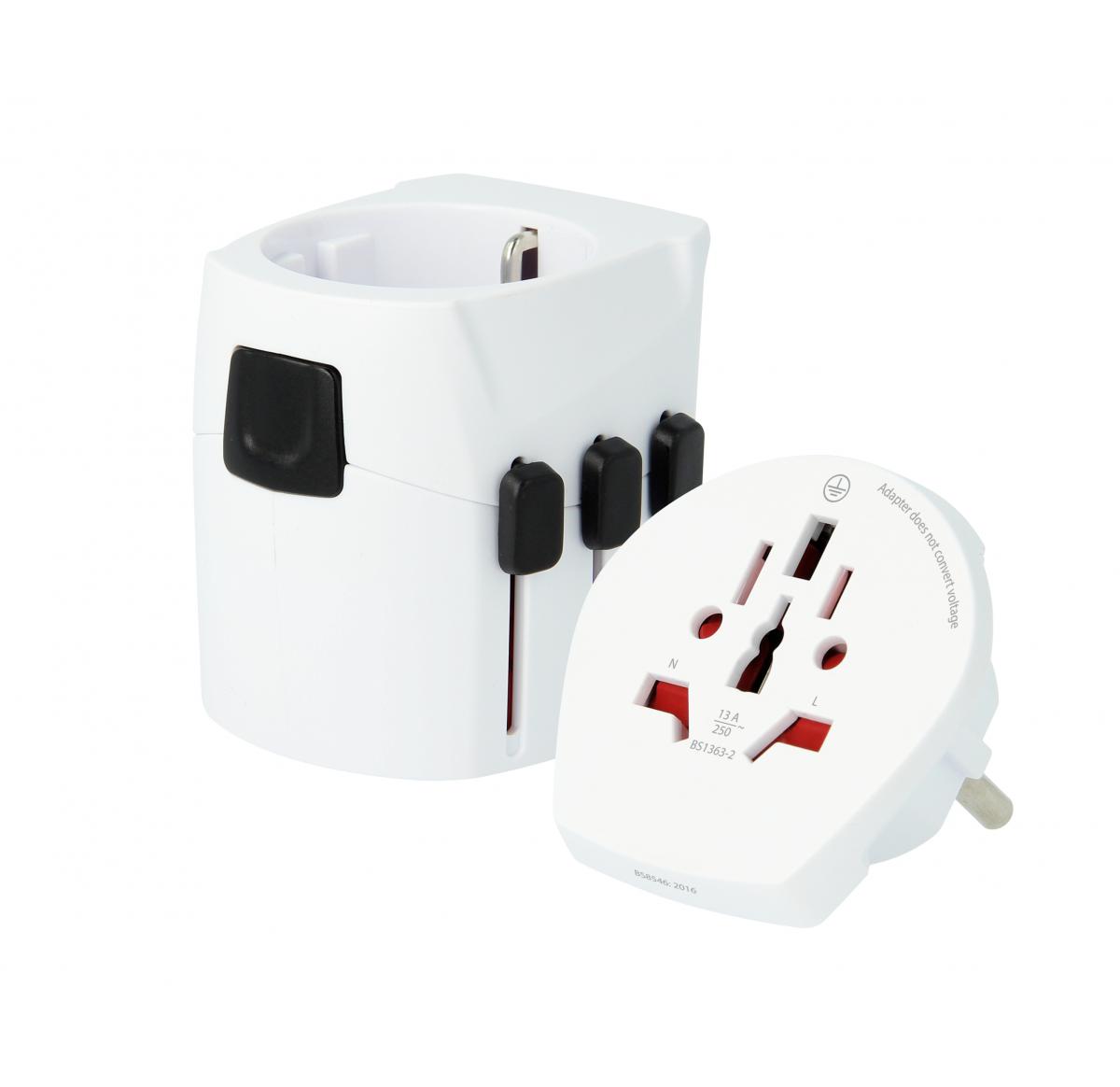 - Truly universal - for devices from more than 220 countries - works in more than 200 countries. - Europe (Schuko) compatible. - Premium high-quality world travel adapter. - Comes with a lifetime replacement warranty. - Set of sliding buttons allows easy selection of pins. - Selected pins then secured by lock button. - Removable adaptor to convert socket end. - Multi-lingual Instruction Leaflet. - Fulfills all relevant safety regulations.