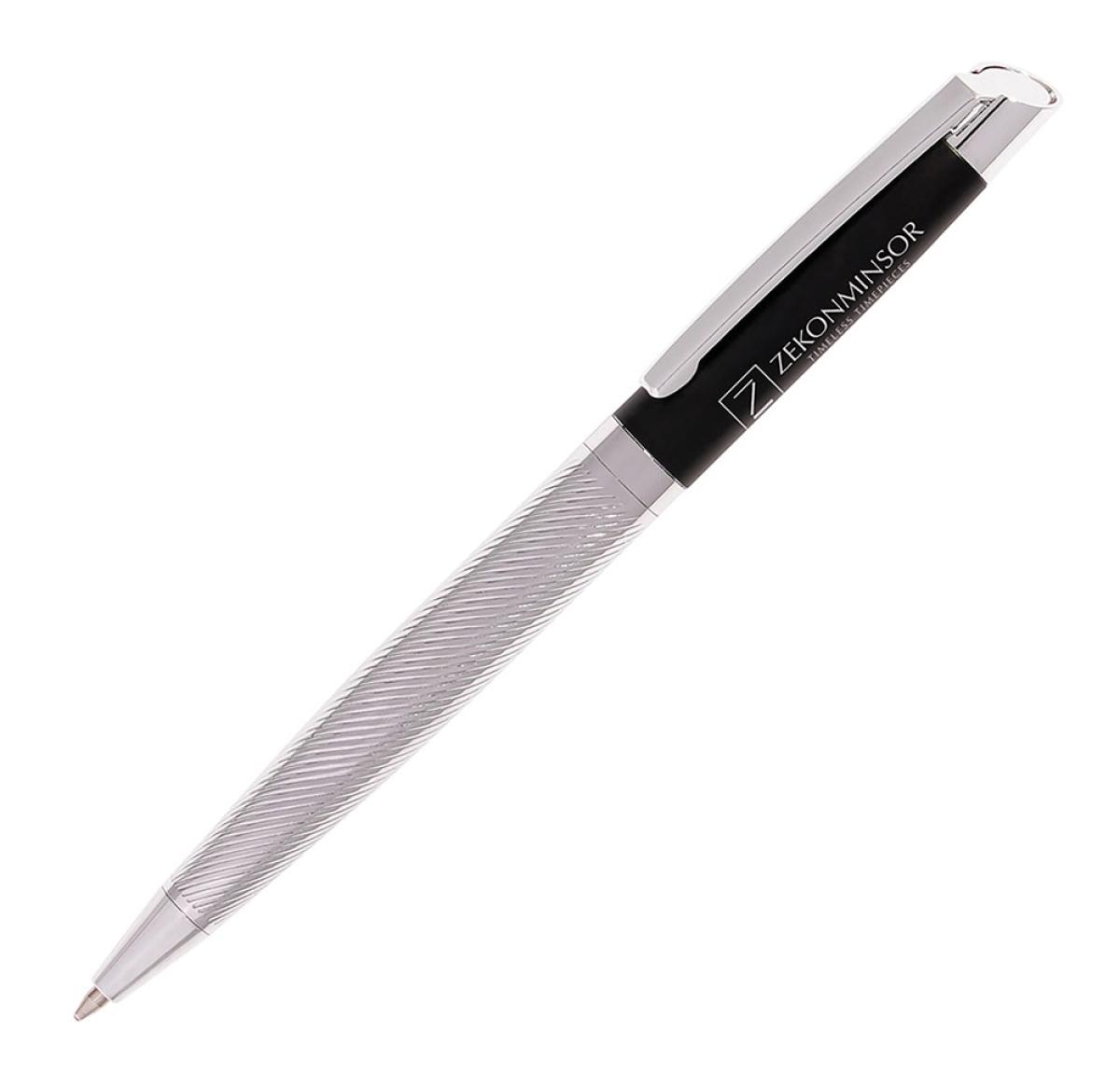 A metal twist action ball pen with a uniquely textured barrel that appears to spiral around the bottom half of the barrel in a striking chrome finish. The contrasting top section of the pen is finished in satin smooth black coating that can be engraved to reveal a stunning chrome logo design or message. The metal 'Parker style' refill included will ensure a long lasting, quality writing experience. When the time comes, replacement refills can be purchased for this product therefore extending its lifespan which makes it more environmentally friendly and boosts the retention of this premium branded gift. The Bonita Ball Pen oozes sophistication and makes the perfect executive gift for special customers and valued employees. This executive level pen can be presented in a number of gift boxes, contact us today to discuss your options.