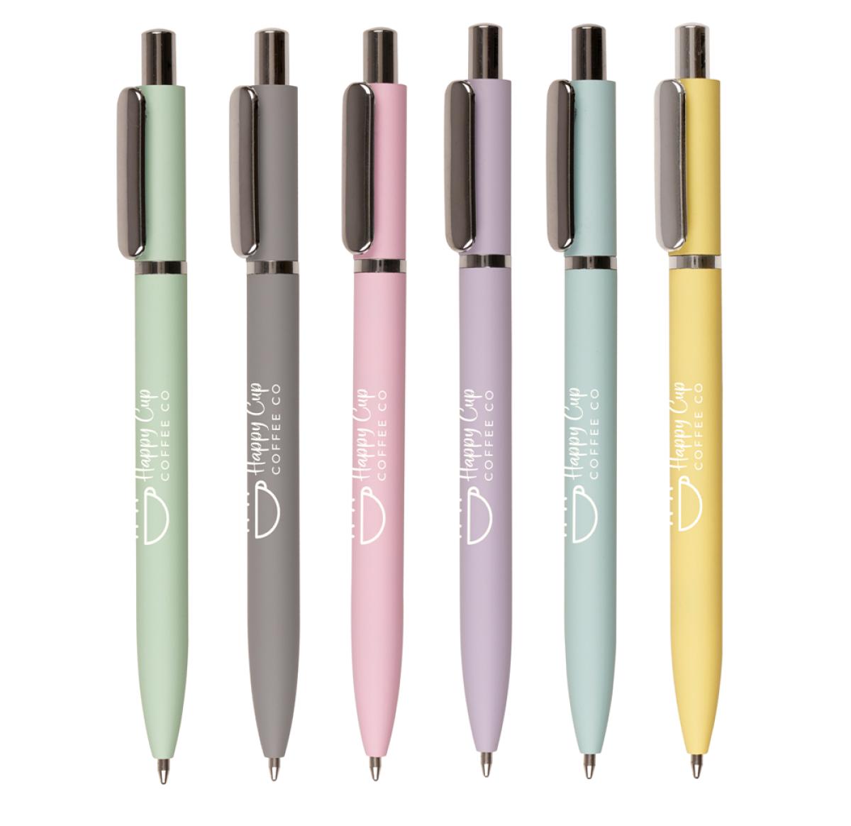 A stylish ball pen featuring a soft feel pastel finish barrel made from recycled aluminium with an iron band, clip, and pusher. This writing instrument features a pre-printed recycled symbol to highlight your company's commitment to using recycled materials and offers exceptional writing performance. With its stylish design and commitment to repurposing waste material, this pen is sure to make a statement . This is the perfect eye-catching giveaway for trade shows, exhibitions and events. Order yours today!