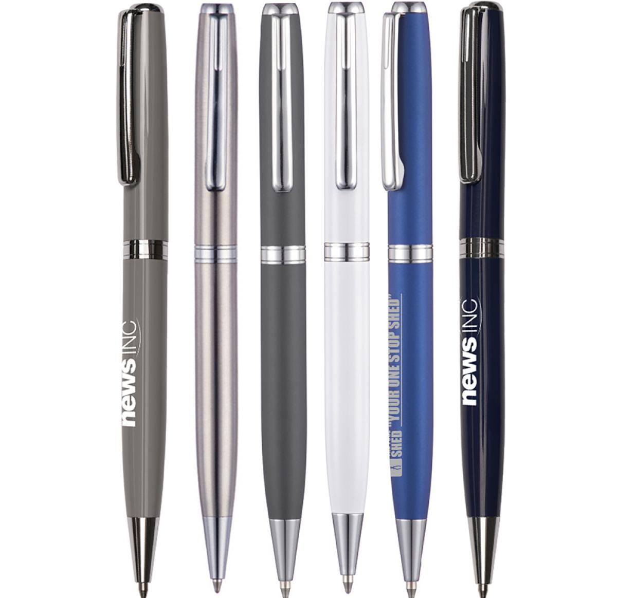 A well balanced twist action ball pen with chrome trim and a special ultra-positive click action that lets you know the refill is locked in place!