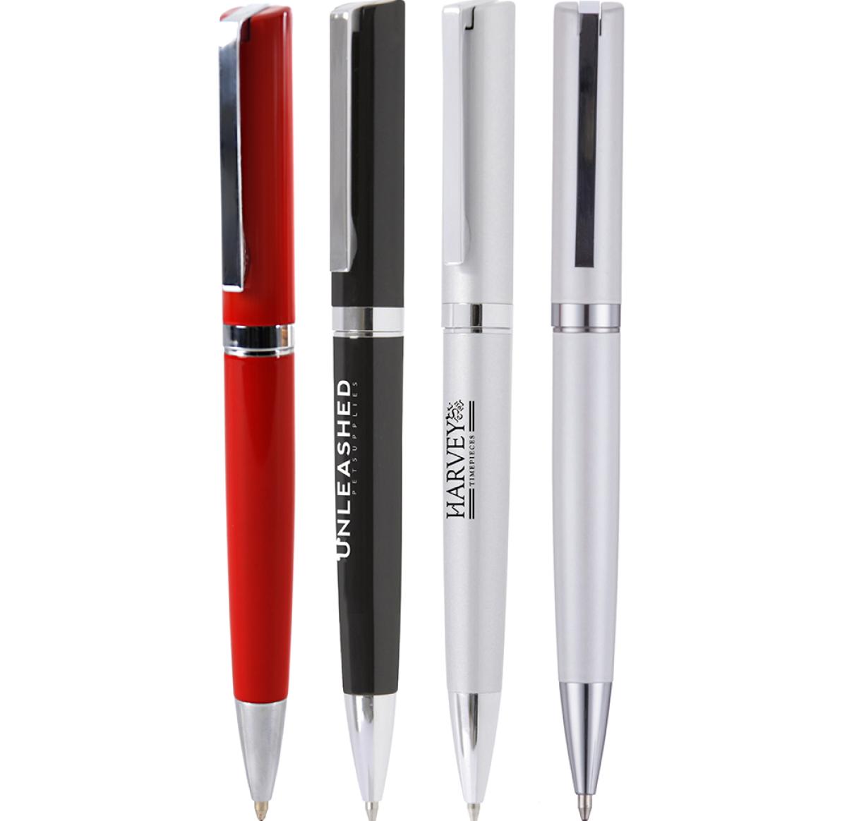 A substantial twist action ball pen with a hinged clip and great print area. Can be supplied on its own or as a set with the matching roller pen