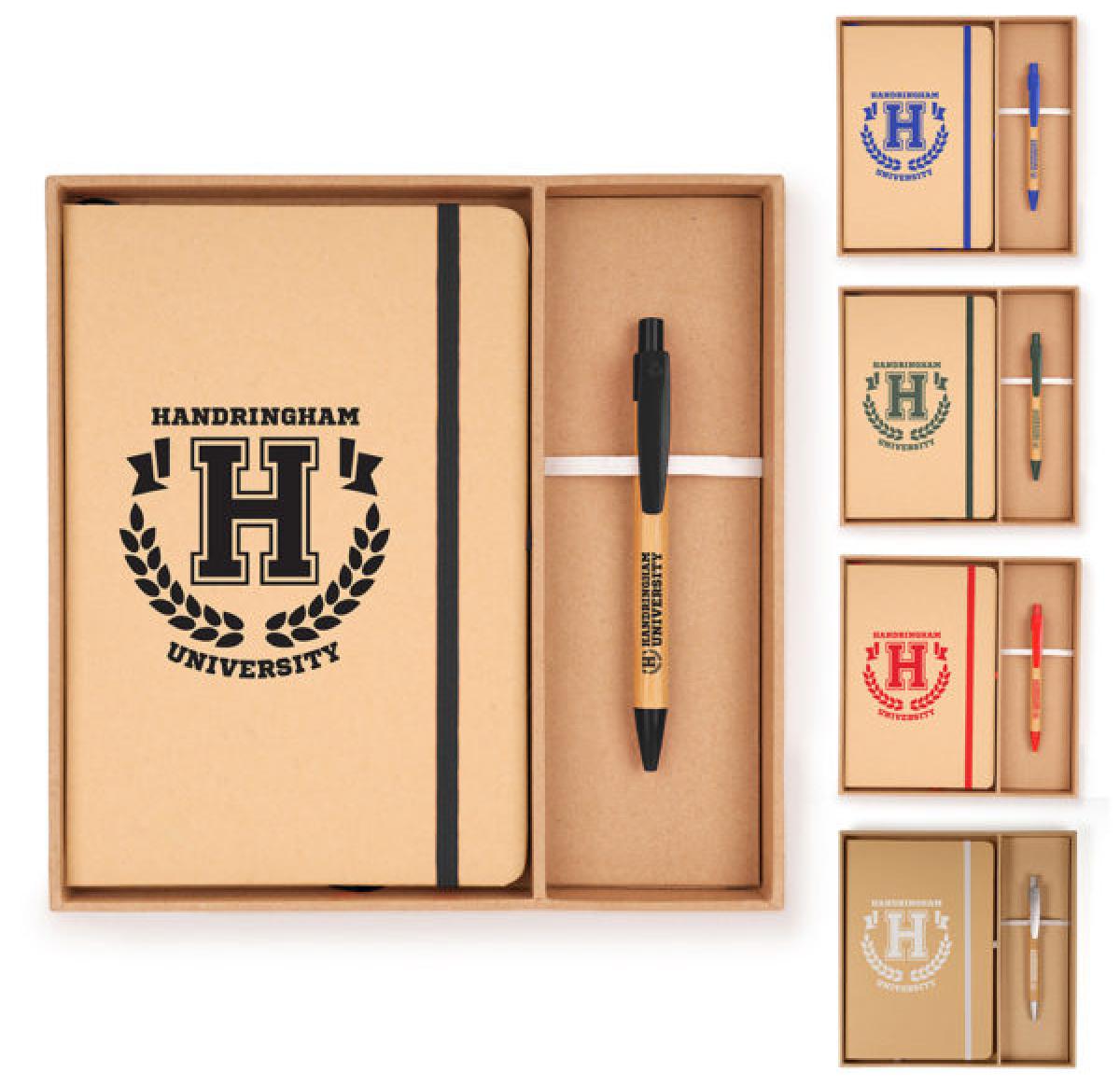 Looking for an set to hand out at a corporate event? The nature notebook and pen set is the go-to set that you have been looking for! Including the Sumo ball pen with a crafted bamboo barrel and the A5 Recycled notebook both available with coloured trims, all packed together in a 100% recyclable and biodegradable card box. All three items in the set can be branded, making it perfect for advertising your company logo. The A5 recycled notebook includes 90 sheets of lined paper and with it being an A5 notebook it makes it easy to carry around on the go to any corporate event. The Sumo bamboo ball pen is a high quality push action ball pen made with ABS recycled plastic trims and a crafted bamboo barrel. Combined with the cardboard box, this set is the perfect gift to hand out at a trade show or any other corporate event. Order yours today!