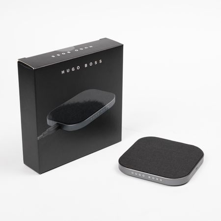 This Hugo Boss wireless charger is not only very practical, but also an eye-catcher on your desk. From now on, you won't need a cable to charge your smartphone. Simply place the device on top and, voilà, it starts charging by itself. Compatible to all Q1 devices. This square design charger has an aluminium finishing with elegant round corners and a subtle Hugo Boss logo. The charging pad is made of fabric. The compact size 84 x 84 x 9.5 mm makes it easy to take the charger with you. This item comes in a luxurious Hugo Boss gift box including 1M Type-C cable and user manual. Available in dark chrome and chrome (silver).