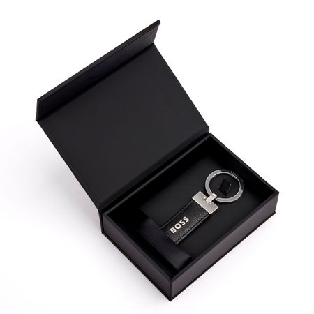 This elegant and timeless keyring is made of the same top-grain, matte-grained leather as the eponymous small leather goods line. The crisp chrome metals are beautifully finished, with the BOSS logo engraved on the keyring. It is signed with a chrome BOSS letterplate. It is available in Black, navy & camel.
