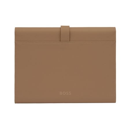 This A5 folder from BOSS blends a feminine camel color with luxurious gold accents. The oversized, light gold-plated Double B closing buckle adds a touch of elegance, while the soft textured PU enhances its sophisticated feel. The warm tones of camel are complemented by the gold details, making it the perfect match for the feminine Arche Double B pen and keyring, ideal for creating stylish gift sets.