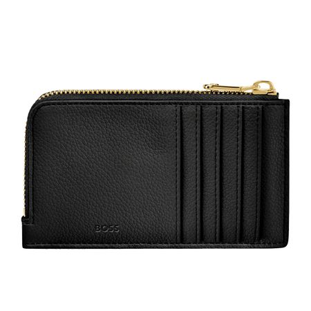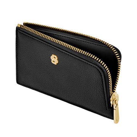 This compact pouch is crafted in grained matte PU and defined by a refined Double B signature plate on the front, complemented by a BOSS logo embossed on the back. The design features newly developed light gold?plated zippers adorned with a Double B detail, bringing a soft and delicate finish while remaining clean and minimal. The back is fitted with five card slots for easy access, while the roomy main compartment includes an additional interior slot for organized storage. Finished entirely with light gold trims, the piece is offered in a soft and vibrant color palette including black, burgundy, taupe, nude, and lilac.