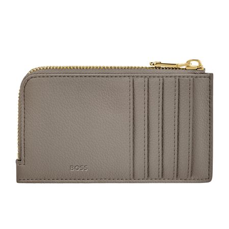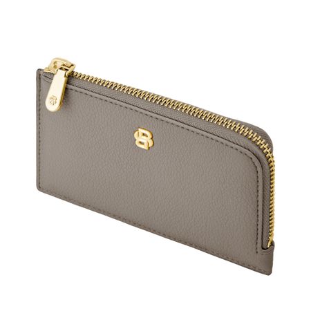 This compact pouch is crafted in grained matte PU and defined by a refined Double B signature plate on the front, complemented by a BOSS logo embossed on the back. The design features newly developed light gold?plated zippers adorned with a Double B detail, bringing a soft and delicate finish while remaining clean and minimal. The back is fitted with five card slots for easy access, while the roomy main compartment includes an additional interior slot for organized storage. Finished entirely with light gold trims, the piece is offered in a soft and vibrant color palette including black, burgundy, taupe, nude, and lilac.