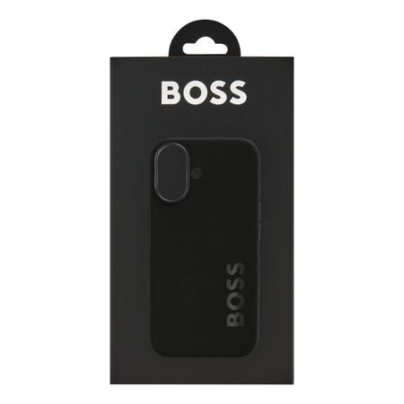 A sleek and minimal case in black matte texture, featuring an oversized embossed BOSS logo for a refined and elegant touch. Crafted from silicone, TPU, and polycarbonate, it ensures durability while supporting magnetic fast charging. Entirely monochromatic and discreetly signed inside with the BOSS logo, it is the perfect accessory to add a touch of understated elegance to the iPhone 16.