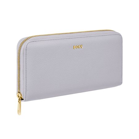 This classic zipped wallet is crafted from carefully selected grained matte PU with a soft, refined hand feel. The design is highlighted by a BOSS logo signature plate on the front and complemented by newly developed light gold?plated zippers featuring a Double B detail. Designed for everyday organization, it offers twelve card slots with six on each side, two note compartments positioned on either side, and a central zipped compartment for secure storage. Finished entirely with light gold trims for an elevated and luxurious touch, the wallet is available in a soft color palette including black, burgundy, taupe, nude, and lilac.