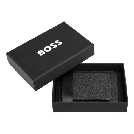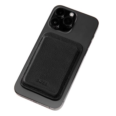 Our magnetic card holder is crafted from top-grain genuine leather. It is equipped with a MagSafe system that allows for adhesion on the back of any phone equipped with the technology. This black version features a beautiful matte texture with pebbled grain and is subtly embossed with the BOSS logo. The finishing touch is a monogrammed lining that adds another subtle element of branding. Despite its minimal and compact design, it can still carry up to 5 cards.