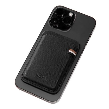 Our magnetic card holder is crafted from top-grain genuine leather. It is equipped with a MagSafe system that allows for adhesion on the back of any phone equipped with the technology. This Iconic version features beautiful black textured leather and is subtly embossed with the BOSS logo. The finishing touch is a monogrammed lining that adds another subtle element of branding. Another distinctive feature of this iconic version is the tricolored textile flag that adorns all items in this series. Despite its minimal and compact design, it can still carry up to 5 cards.