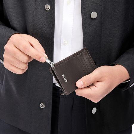 The Classic Smooth line is crafted from carefully selected top-grain leathers, defined by their sleek, refined texture that embodies timeless sophistication. Each piece is meticulously assembled and finished with a crisp chrome BOSS signature plate and a tone-on-tone monogram lining, a testament to expert craftsmanship. Available in black or brown, this zipped card holder features a spacious main compartment with gusset, complemented by five front card slots ? striking the perfect balance between practicality and understated elegance.