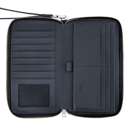The Classic Grained line is crafted from carefully selected top-grain leathers, defined by minimalist designs that embody timeless sophistication. Each piece is skillfully assembled and beautifully finished with a crisp chrome signature plate and monogram linings, reflecting refined craftsmanship. Available in black, navy, and camel, this zipped wallet is completed with the new signed BOSS zipper puller in perfect harmony with the trims. Inside, it reveals a spacious and practical layout: the left side includes 8 card slots and a large compartment, while the right side functions as a full wallet with a double gusset, a large zipped coin compartment, 12 card slots, and an additional note compartment. Both functional and luxurious, it offers an elegant solution for everyday essentials.