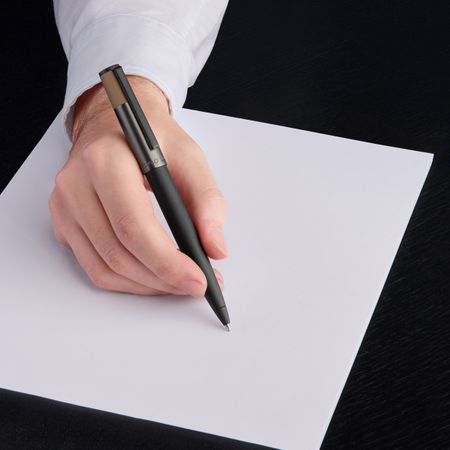 Our Gear family is our most iconic writing instrument collection. This season, it returns in a truly unexpected fashion: three writing instruments ? ballpoint, fountain pen, and rollerball ? are mixed and matched, each featuring three distinct textures: deep brushed black, sleek matte gunmetal, and a rubberized lacquer in the iconic camel. The proportions of each piece harmonize with one another, creating a simple yet truly unexpected edition of this market-favorite silhouette. The double B engraved logo at the top gives the perfect, cohesive final touch to these pieces.