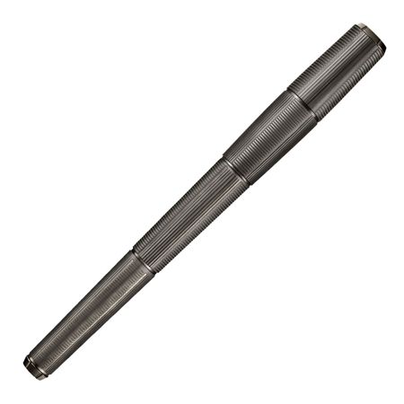 The Meridien pen reveals a futuristic, angular silhouette defined by a precise sequence of vertical and horizontal deep-engraved stripes. This graphic interplay forms a modern interpretation of the timeless herringbone pattern, giving the pen a sense of movement and structure. The minimal matte gunmetal plating reinforces its clean geometry, resulting in a piece that feels confidently modern and distinctly architectural.