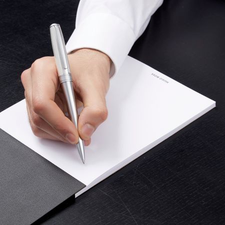 One of our iconic writing instrument lines is re-edited with a slightly updated silhouette for a more aerodynamic feel. These monochromatic pieces, available in silver or gunmetal, boast opposing, distinctive surfaces: matte plated metals and ultralacquered, diamond-engraved surfaces.