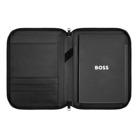 This A5 folder showcases a bold yet restrained graphic BOSS cut-out logo, layered over contrast mesh fabric for a distinctive active look. The smooth black PU exterior is contrasted with grey mesh nylon, creating a subtle dialogue between sleek surfaces and technical texture. An oversized logo anchors the design while maintaining a minimal, contemporary balance. Completed with an exclusive new BOSS zipper puller and matte black trims, the piece conveys a modern, active spirit with a refined edge.